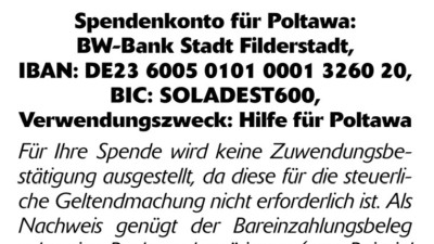Als Stiftung von Bürgerinnen und Bürgern in Filderstadt unterstützen wir den Spendenaufruf der 3 Kommunen Filderstadt, Leinfelden-Echterdingen und Ostfildern zugunsten unserer Partnerstadt Poltawa/Ukraine. Wir sind mit einer Spende von 1.000 Euro aktiv geworden und ermutigen Menschen, Vereine, Unternehmen etc. in den Partnerstädten ebenfalls solidarische Hilfe zu leisten, sei es durch eigene Geldspenden oder andere materielle Hilfen.